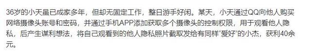 他自己控制了1800个摄像头,还和别人分享,卖了40元,买家小杰也是个偷窥爱好者,也控制了一些摄像头,同样被判刑。罪名是非法控制计算机系统罪,其实也是偷窥、侵犯他人隐私了,但是这个罪名如果不是大量的扩散,商业用途,盈利,可能就是一般治安案件。小天可能觉得我们就是个人观看,不大面积扩散传播,也不用于商业目的,但是还有非法侵入计算机信息罪呢,一样判刑。