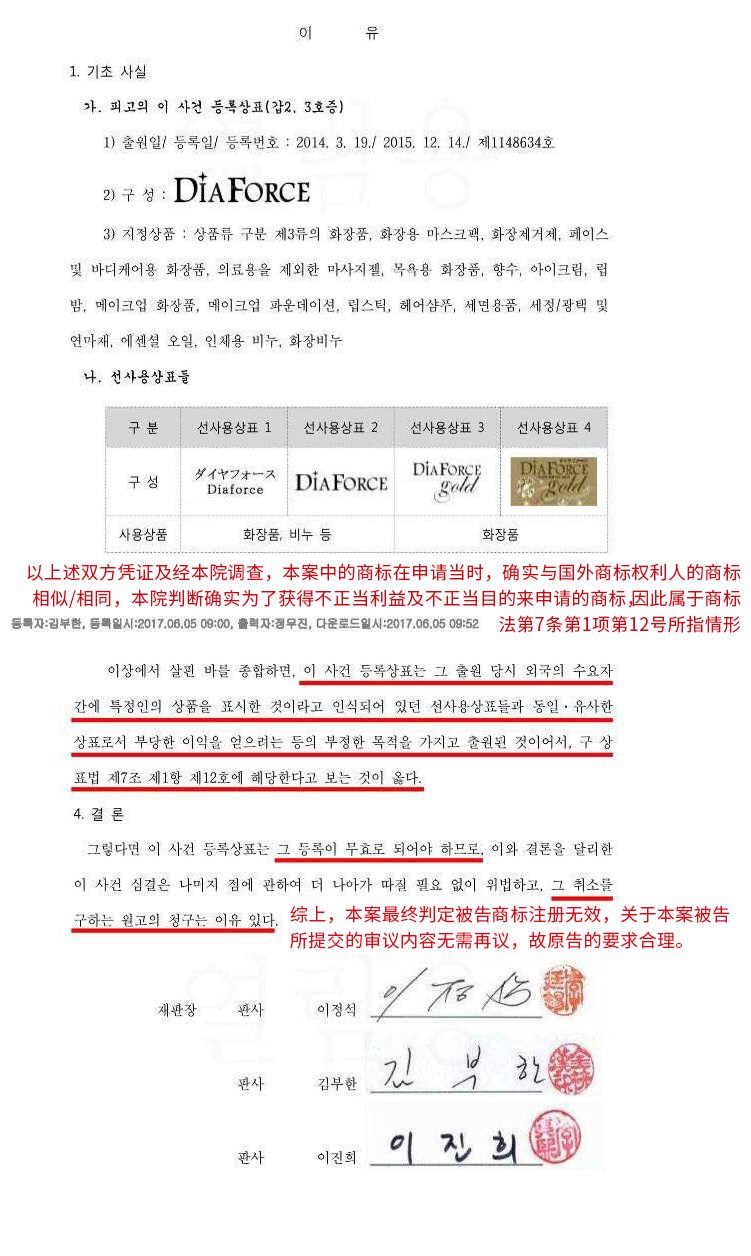 近日,株式会社蓓丽诉株式会社Miskin “Diaforce贵妇眼膜商标注册无效案”历时一年多,在韩国专利法院判决下,已于日前正式结案。判决书判定: 被告韩国株式会社Miskin为了获得不正当利益而故意将其名称、商标、包装进行恶意模仿,并带有非正当目的注册申请Diaforce贵妇眼膜商标, 该商标注册无效。Diaforce贵妇眼膜商标归株式会社蓓丽所拥有。