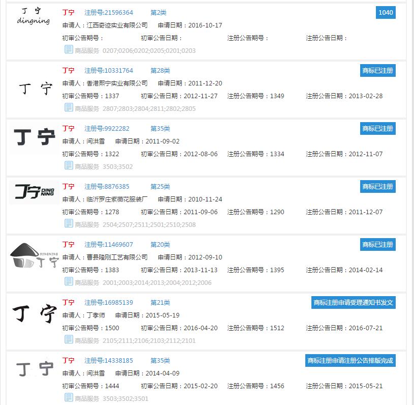 一品标局讯 6月4号晚,2017年世乒赛女单决赛开战。丁宁以大比分4-2战胜朱雨玲,获得了冠军。在这次世乒赛上,丁宁展现了乒乓球女王的气质,用精彩表现夺回了属于她的至高荣誉。在沉浸在夺冠的喜悦之余,大掌柜也不由自主关心起与丁宁有关的名字商标了。丁宁的名字是否已经被抢注商标?大掌柜通过一品标局商标查询系统发现,果不其然!丁宁的名字也没躲过商标抢注这一劫。发现已经注册为“丁宁”商标的竟有9件!不得不惊叹国人的商标抢注能力总是出奇的神速!