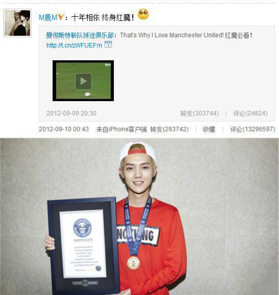 鹿晗表白曼联的一条微博“十年相依,终身红魔”,评论超千万,获得吉尼斯纪录